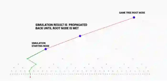 反向传播是从叶节点(模拟开始)到根节点的遍历。模拟结果被传送到根节点,并且对于反向传播路径上的每个节点更新某些统计信息。反向传播保证每个节点的统计数据反映在其所有后代中开始的模拟结果(因为模拟结果被传送到游戏树根节点)。