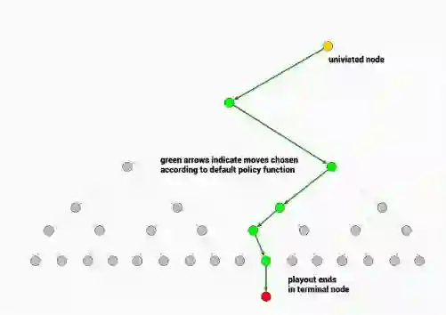 我们首先关注模拟,因为它不会严重依赖其他术语的定义。模拟是一种单一的游戏行为,是一系列从当前节点开始,并终止于可计算游戏结果的终端节点的动作序列。模拟是通过在该节点处开始以某种方式随机游戏来计算的游戏树节点评估近似值。在模拟过程中如何选择动作?在模拟过程中,选择一个称为“转出策略”的函数: