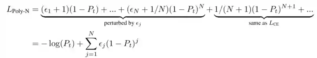 为了解决这一问题,作者提出扰动交叉熵损失中的重要的多项式系数(前N项),同时保持其余部分不变。将所提出的损失公式表示为 ,其中N表示将被调整的重要系数(前N项)的数量。