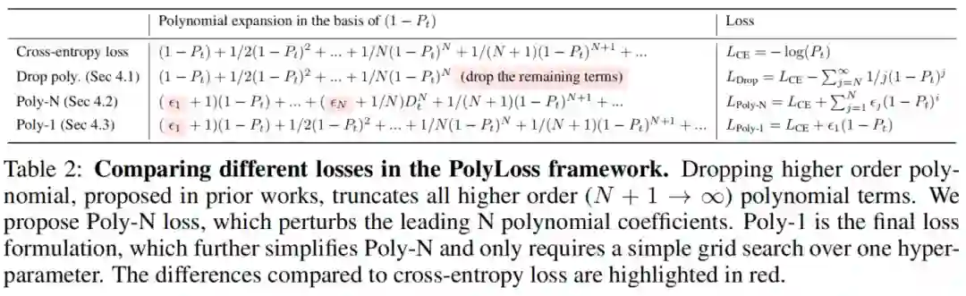 在本文中提出了在PolyLoss框架中设计一个新的损失函数的替代方法,其中调整了每个多项式的系数。一般来说,有无穷多个多项式系数
