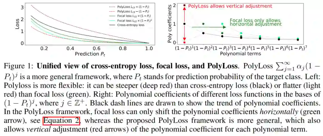 Insights on common losses:提出了一个统一的损失函数框架,名为PolyLoss,以重新思考和重新设计损失函数。这个框架有助于将Cross-entropy loss和Focal loss解释为多损失族的2种特殊情况(通过水平移动多项式系数),这是以前没有被认识到的。这方面的发现促使研究垂直调整多项式系数的新损失函数,如图1所示。