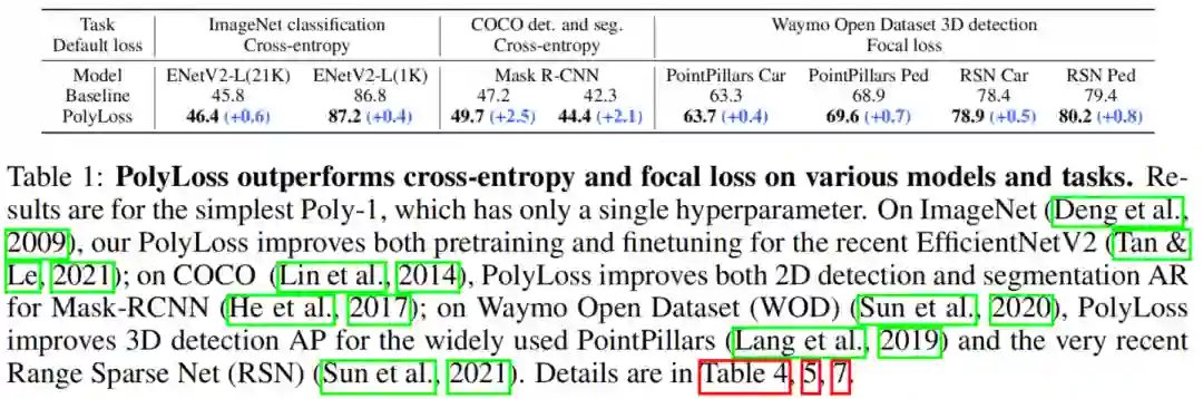PolyLoss内的最优选择确实依赖于任务和数据集。只需引入一个额外的超参数和添加一行代码,PolyLoss在二维图像分类、实例分割、目标检测和三维目标检测任务上都明显优于Cross-entropy loss和Focal loss。