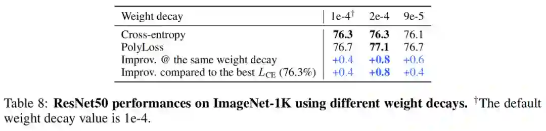 注意,所有训练超参数都针对Cross-entropy loss进行了优化。即便如此,对Poly-1公式中的第1个多项式系数进行简单的网格搜索可以显著提高分类精度。作者还发现对LPoly-1的其他超参数进行优化还可以获得更高的精度。