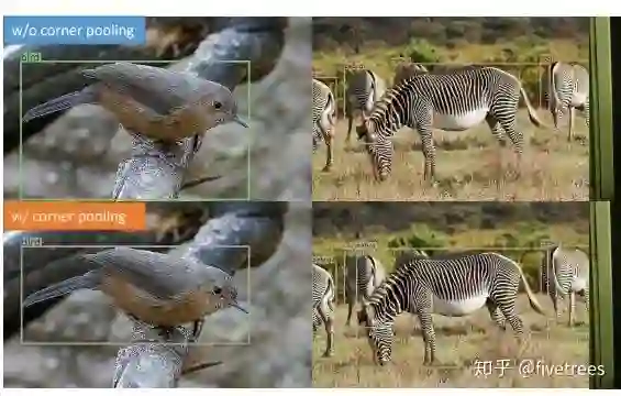可以看出有了Corner pooling,预测的目标边界框的角点,位置信息更加的精确了。