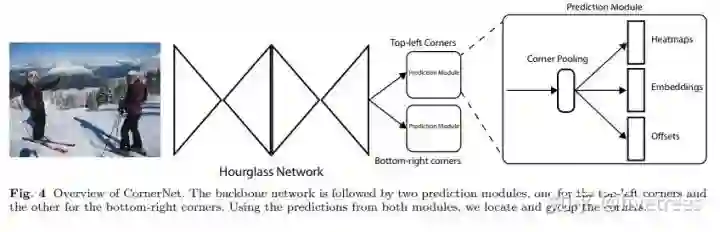 首先原图经过 1 个 7×7 的卷积层将输入图像尺寸缩小为原来的 1/4 (论文中输入图像大小是 511×511,缩小后得到 128×128 大小的输出),然后经过特征提取网络 Hourglass network 提取特征,Hourglass module 后会有两个输出分支模块,分别表示左上角点预测分支和右下角点预测分支,每个分支模块经过应该 Corner pooling 层后输出3个信息: