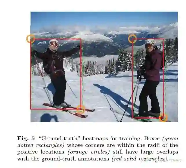 为 4),pcij 表示预测的 heatmaps 在第 c 个通道(类别 c )的 (i,j) 位置的值,ycij 表示对应位置的 ground truth,ycij=1 时候的损失函数就是 focal loss;ycij 等于其他值时表示 (i,j) 点不是类别 c 的目标角点,照理说此时 ycij 应该是 0(大部分算法都是这样处理的),但是这里 ycij 不是0,而是用基于 ground truth 角点的高斯分布计算得到,因此距离 ground truth 比较近的 (i,j) 点的 ycij 值接近 1,这部分通过 β 参数控制权重,这是和Focal loss 的差别。为什么对不同的负样本点用不同权重的损失函数呢?这是因为靠近 ground truth 的误检角点组成的预测框仍会和 ground truth 有较大的重叠面积。