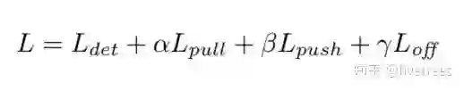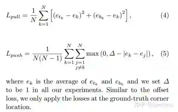 公式 4 用来缩小属于同一个目标(第 k 个目标)的两个角点的 embedding vector( etk 和 ebk )距离。公式 5 用来扩大不属于同一个目标的两个角点的 embedding vector 距离。