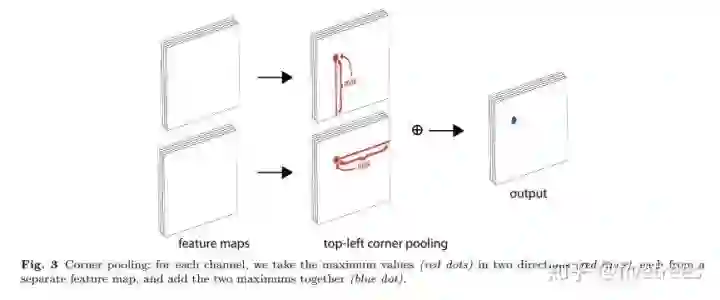 1. Corner pooling:更好的定位角点,一个角点的定位不能只依靠局部信息,Corner pooling 层有两组特征图,相同的像素点,汇集值一个是该像素水平向右的最大值,一个是垂直向下的最大值,之后两组特征图求和;