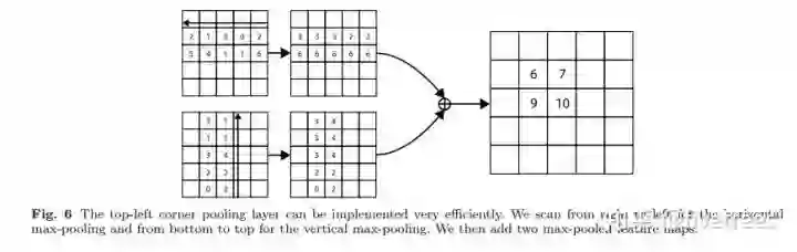对于右下角点的 Corner pooling 操作类似,只不过找最大值变成从 (i,j) 到 (0,j) 和从 (i,j) 到 (i,0) 中找。比如 Figure6 中,第一张特征图,比如第 2 行的第 1 个点(值为2),其右边同一行的最大值是 3 ,故经过 Corener Pooling 后,其值变为3,其他同理;第 2 张特征图,第 2 列的第一个点为 3,其下面所在列的最大值(包括本身)也是 3,因此经过 Corener pooling 之后,其中也变为 3,最后将 2 张特征图对应位置的点的特征值相加,得到一张特征图。