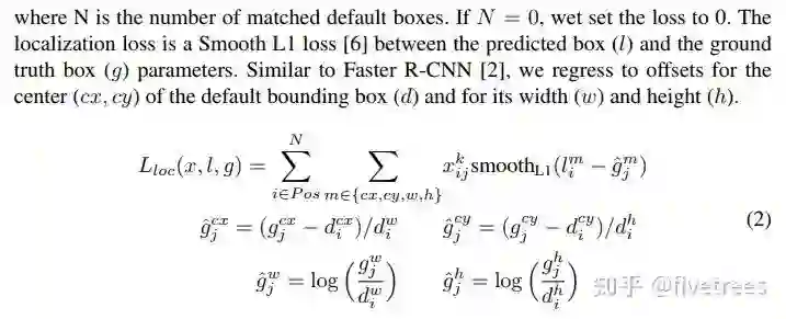 回归策略基本和 Faster R-CNN 中一致,对边界框的回归的损失函数也是采样的 Smooth L1 损失函数,不过这里的先验框名字叫 Default Box 和 Faster R-CNN 中的 Anchor 叫法不一样。
