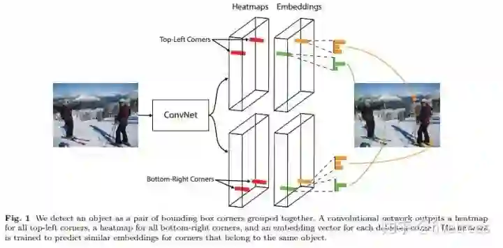 负责检测哪个 top-left corner 和哪个 bottom-right corner 是一对,组成一个 box,同一个 box 的 corner 距离短。top-left 和 bottom-right corner 各预测一个 embedding vector,距离小的 corner 构成一个 box