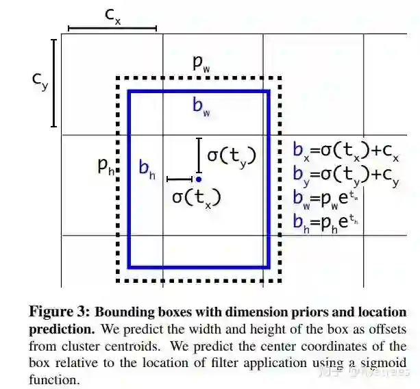 YOLOv2 中作者引入了 Faster R-CNN 中类似的 anchor,但是回归策略不同,对 bbox 中心坐标的预测不是基于 anchor 坐标的偏移量得到的,而是采用了 v1 中预测 anchor 中心点相对于对于单元格左上角位置的偏移,如下图