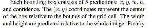 YOLOv1 先将每幅图片 reshape 到 448x448 大小,然后将图片分成 7x7 个单元格,每个格子预测 2 个边界框,而每个边界框的位置坐标有 4 个,分别是 x,y,w,h。