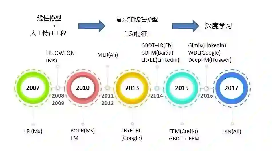 工业界的推荐方法经历从线性模型+大量人工特征工程[11] -> 复杂非线性模型-> 深度学习的发展。Microsoft首先于2007年提出采用Logistic Regression来预估搜索广告的点击率[12],并于同年提出OWLQN优化算法用于求解带L1正则的LR问题[13],之后于2010年提出基于L2正则的在线学习版本Ad Predictor[14]。