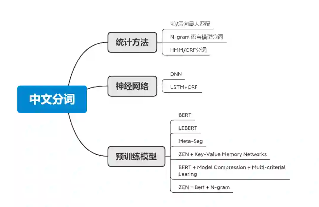 本文的思维导图如下图所示。其中,“统计方法”和“神经网络”两部分会简单介绍一下早期的传统做法,熟悉的同学可以直接跳过。主体在最后的“预训练模型”部分,会带大家梳理一下2020年以来的最前沿的一些中文分词工作。