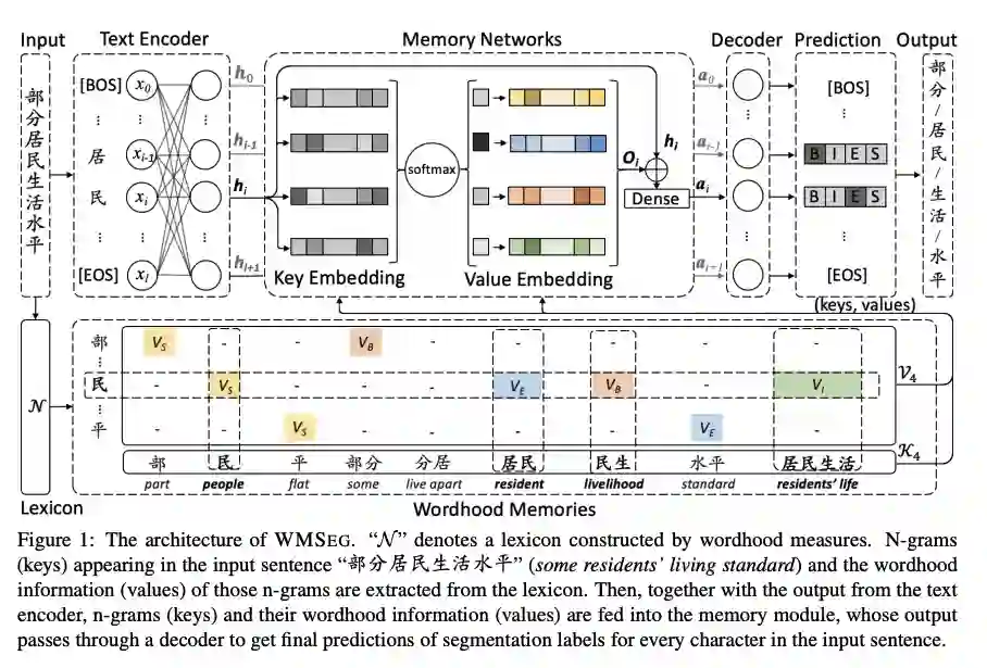 Encoder 可以是任意的网络(BERT/ZEN),Decoder部分则是 Softmax 或者 CRF 。核心是 Wordhood Memory Networks。