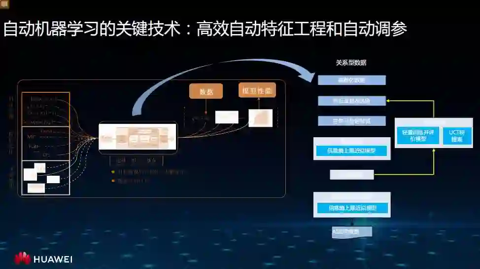 另外,由于深度学习向计算机视觉输入原始数据,整个特征工程是在神经网络里面做的,而机器学习需要很多算法工程师去识别哪些特征是对业务是起正向作用的,所以自动机器学习的关键技术,就是高效自动特征工程和自动调参。
