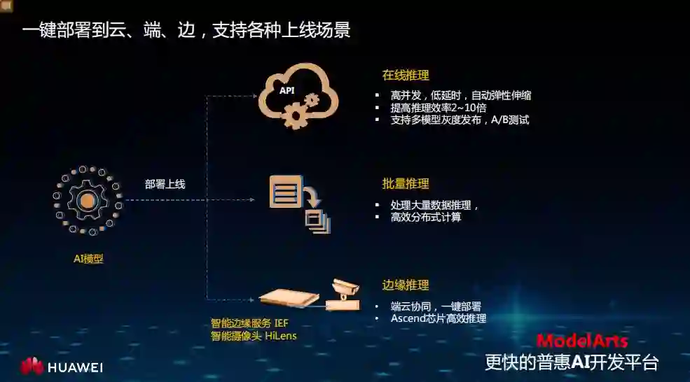 对于此类场景,ModelArts 可以一键推送模型到所有边缘、端的设备上,云上的部署还支持在线和批量推理,满足大并发和分布式等多种场景需求。