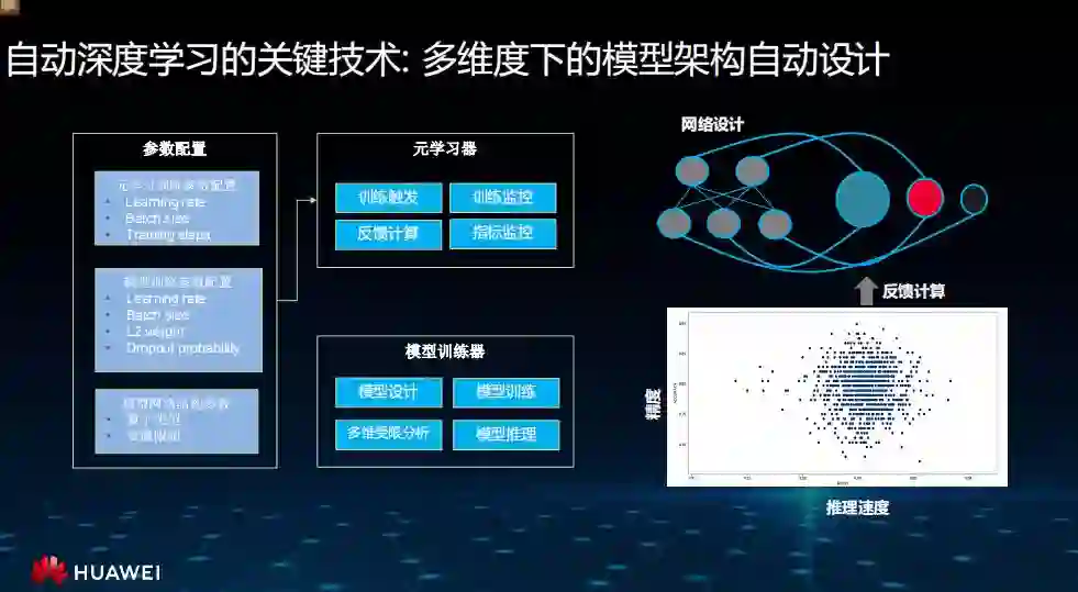 在自动深度学习里面,关键的技术是能够做到多维度下的模型的架构自动设计,包含模型的元学习,涉及一些训练指标,还有推动网络涉及的推理速度和监控等。另外还包括一些元学习的训练参数的自动配置、模型训练的参数配置及搜索等。