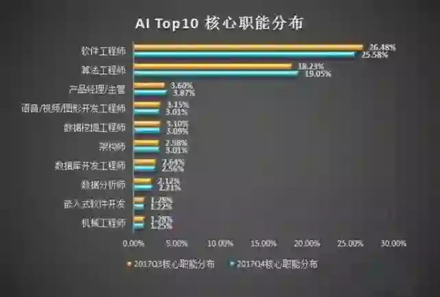 而据猎聘大数据研究院近期发布的问卷调研中发现,AI 核心职能对学历要求明显增高,AI 人才主要分布在北京、上海和深圳这三个一线城市,在行业方面,AI 人才的分布以互联网为主,但也向其它行业逐渐渗透。在 Top 10 核心职能上,AI 软件工程师和算法工程师遥遥领先,是最紧俏的职能岗位。