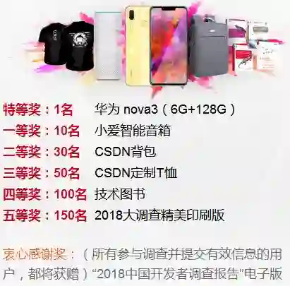此外,我们还为你准备了精美的礼品,华为 nova3 智能手机、小爱智能音箱、CSDN 背包、CSDN 定制T恤、数百本技术图书等你来拿!参与即有机会获赠,还等什么,快来试试吧!