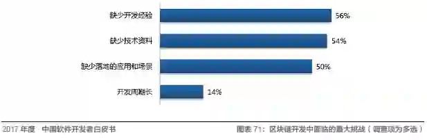 此外,区块链当前的应用仍相对较少。CSDN 调查显示,正在用或者准备用区块链技术解决技术问题的人群仅占受访者的 10%,有 20% 的人对区块链完全不了解。缺少开发经验、技术资料以及落地的应用和场景是当前区块链开发的主要挑战,此次调研中分别占 56%、54%、50%。