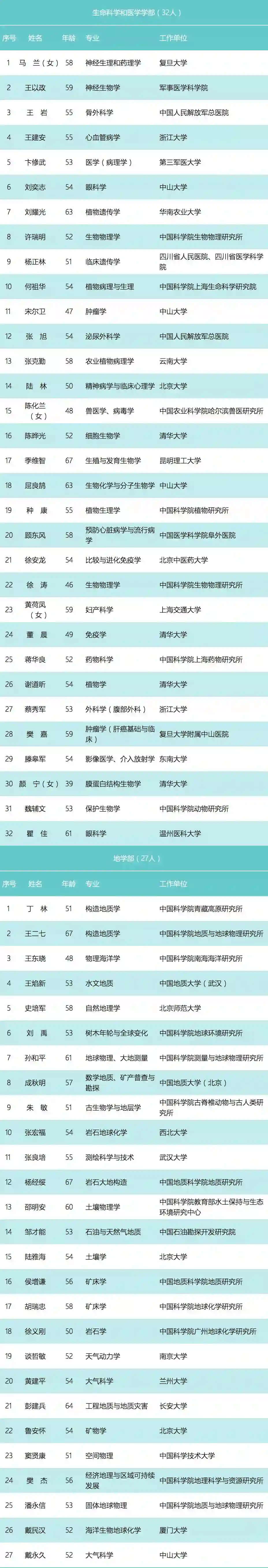 中国科学院各学部初步候选人分布如下:数学物理学部23人、化学部25人、生命科学和医学学部32人、地学部27人、信息技术科学部20人、技术科学部30人。