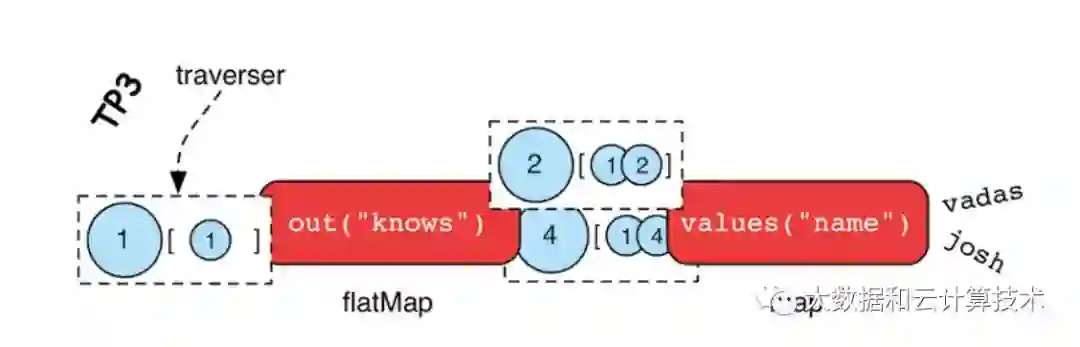 当开始执行traversal时,traversal的源在表达式的左边(示例中的vertex1,marko节点)这些steps在traversal中间(示例种 out(‘knows’)以及values(‘name’)) 通过不断执行”traversal.next”输出到右边的结果(示例中的’vadas’和’josh’)