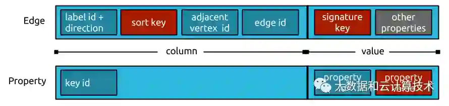 每个边或者属性会保存在顶点的邻接表row的cell中。序列化之后的column数据字节序也反映了原来的Edge标签的key序。一个体系的ID编码和压缩的对象序列化易于使得每个cell保持尽可能少地占用后端存储空间。 一条边信息会被出度、入度vetex保留两遍,便于快速定位到邻接节点,可避免表级联查询。 从当前节点拿到edge信息,拿到邻接vetex id,再做一次指向性query即可traversal到其他节点。