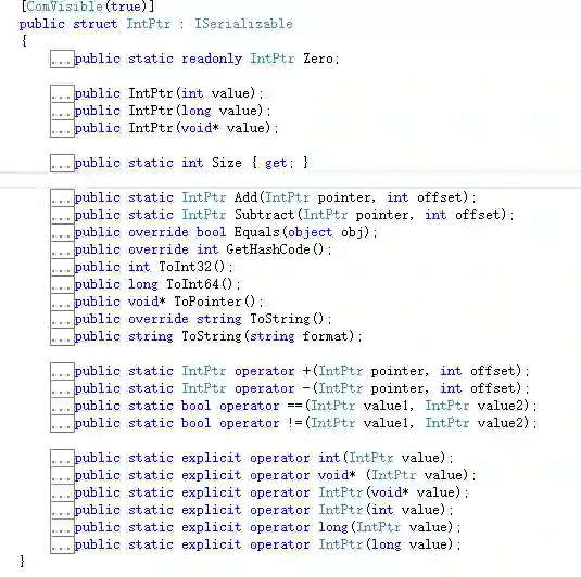 从图中我们可以看到,句柄IntPtrt里包含创建指针,获取指针长度,设置偏移量等等方法,并且为了编码方便还声明了些强制转换的方法。