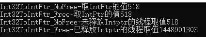 Console.WriteLine("Int32ToIntPtr_NoFree-未释放Intptr的线程取值" + afterNoFree);