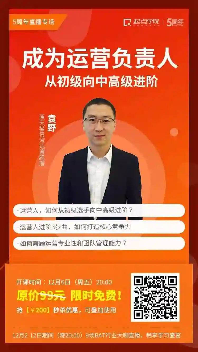 人人都是产品经理社区&起点学院特邀腾原网易严选高级渠道运营经理、原美的厨电电商渠道经理、原天猫资深运营经理 @袁野,用1个小时的时间,跟大家聊聊,做运营,如何打造核心竞争力,从初级选手向高阶选手进阶,又如何兼顾运营专业性和团队管理能力?