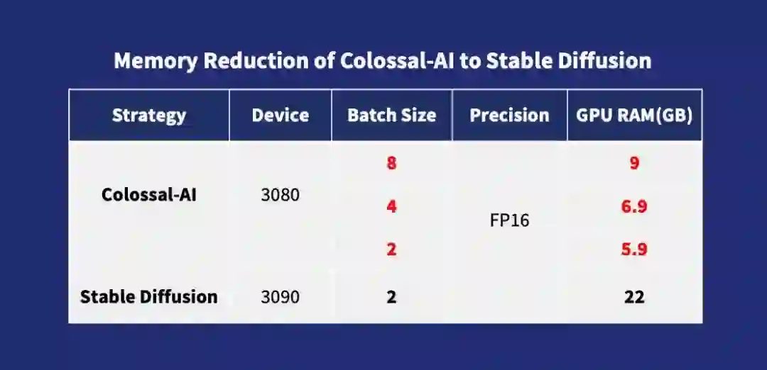 通过ZeRO、Gemini、Chunk-based内存管理等策略以及Flash Attention模块优化Cross-attention计算,Colossal-AI可以让用户在8GB显存的普通消费级显卡(如RTX 2070/3050)上训练扩散模型。