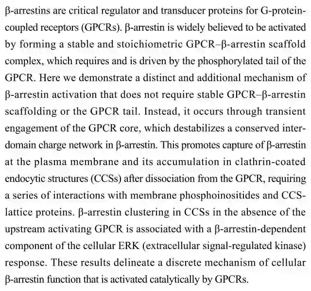 (导读 陈月欣)β-抑制蛋白是G蛋白耦合受体(GPCR)的重要调节及传导蛋白。β-抑制蛋白的活化一直以来被认为需要GPCR的磷酸化尾部。本研究发现另一种活化机制:GPCR内核部分可改变β-抑制蛋白内部的电子网,使β-抑制蛋白积聚于网格蛋白包被的内吞结构(CCS)中,进而激活胞内ERK。
