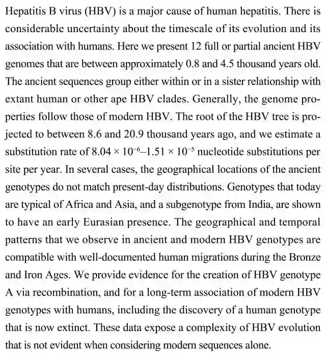 (导读 陈月欣)乙型肝炎病毒(HBV)是肝炎的主要病因之一。HBV 的演化历史及其与人类历史的联系尚不明确。我们通过研究12种古代及中世纪 HBV基因组发现,HBV 的演化树最早可追溯到 8600-20900 年前。另外,通过对比 HBV 现代与古代基因型的分布发现,HBV 亚型的时空分布与青铜及铁器时代人类迁徙路线相吻合。