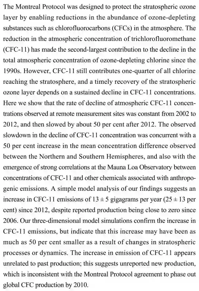 (导读 卓思琪)三氯氟甲烷(CFC-11)消耗臭氧层,平流层臭氧的恢复程度决于 CFC-11 浓度的持续下降。本研究发现从2002~2012年,大气层中CFC-11 浓度的下降速率不变,2012年后则减缓了约50%。三维模型模拟证实 CFC-11 排放量增加了,但与过去的产量无关,表明2010年后有未经报告且违反《蒙特利尔协议》的 CFC 产品排入大气。