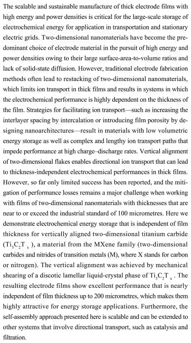 (导读 卓思琪)传统电极制造使电化学性能高度依赖活性涂层膜厚度,而垂直排列的二维薄层可避免厚度限制,但解决性能损失仍具挑战。本文报道了MXene 系列材料二维碳化钛(Ti3C2T x)与膜厚度无关的电化学储能。通过机械剪切而成盘片状垂直排列的材料表现出优异性能。该组装方法可扩展应用到其他定向运输系统中。