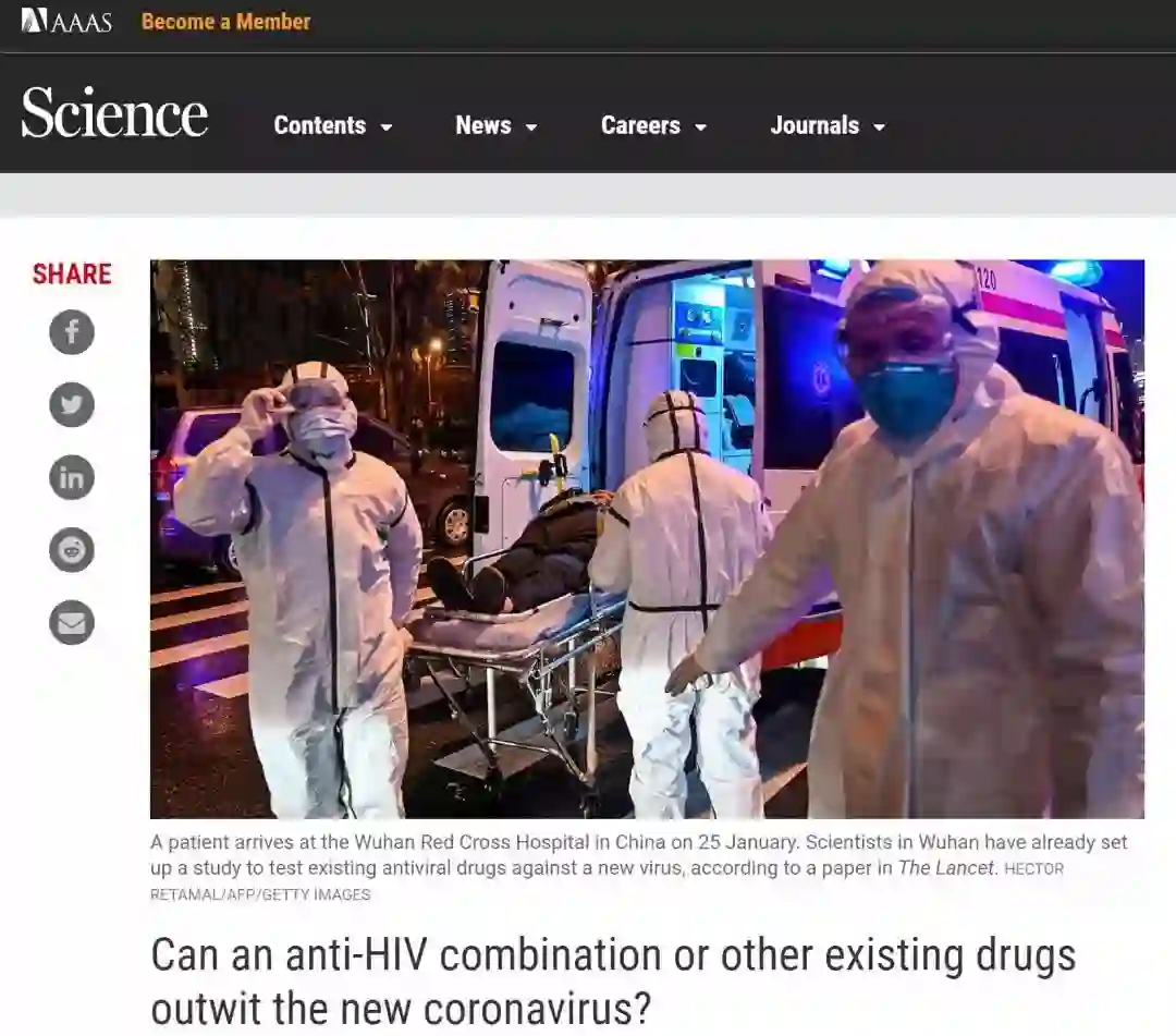 《科学》杂志的报道曾大力推荐瑞德西韦,多位顶尖学者称此药为用于抗新冠病毒最有希望的选择,其潜力胜过抗艾滋药物克力芝。这是美国生物制药公司吉利德(Gilead)的产品,该药还在埃博拉病毒感染的临床治疗研究阶段,目前并无上市。