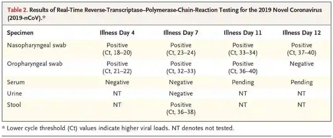 患者发病第 11 天和第 12 天采集的鼻咽和口咽样本显示出病毒载量下降趋势。发病第 12 天采集的口咽样本呈 2019-nCoV 阴性。研究者仍在等待上述日期采集的血清样本 rRT-PCR 结果。