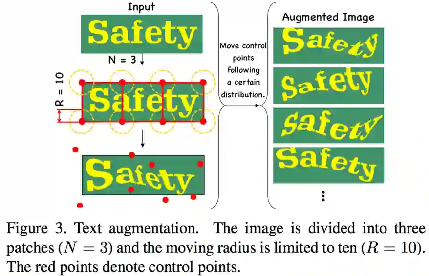 给定一张文本行图像,几何增广的目的是增加每个字符的几何多样性。从这个角度出发,作者在图像上初始化更多的控制点,并移动这些控制点以扭曲图像,如Figure 3所示。