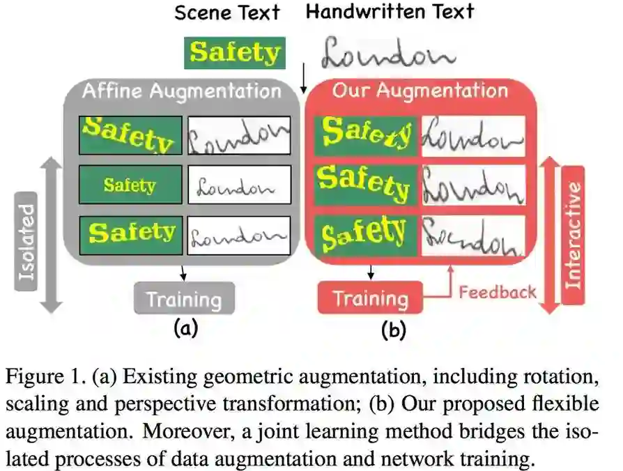 风格多变的手写文本和形状各异的场景文本,因为几何形变问题,给识别任务带来巨大的挑战[1] [2] 。在深度学习时代,为了训练一个鲁棒的识别器,大量的训练样本是必不可少的。相对于数据收集和标注来说,数据增广的成本更低,是值得选择的初步解决方案。然而,如Figure 1(a)所示,现有的几何变换方法,如旋转、缩放和透视变换,对于文本行图像来说过于简单。一张文本图像通常包含若干个字符,更合理的增广方式应该是增加各个字符的几何多样性。因此,该论文提出一种面向文本行图像的几何增广方法,可以结合识别器联合训练。据我们了解,这有可能是第一个针对文本行图像设计的联合学习优化几何增广方法。
