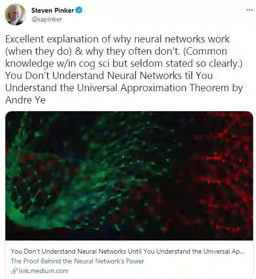 而 LeCun 转发的内容来自哈佛认知科学家 Steven Pinker 的一条推文,Pinker 表示:「 通用近似定理很好地解释了为什么神经网络能工作以及为什么它们经常不起作用。只有理解了 Andre Ye 的通用近似定理,你才能理解神经网络。」