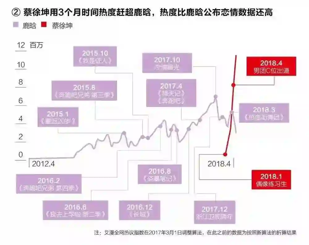 到了2018年,鹿晗已经快被拍死在了沙滩上——蔡徐坤仅用了三个月,就赶超了鹿晗的热度。