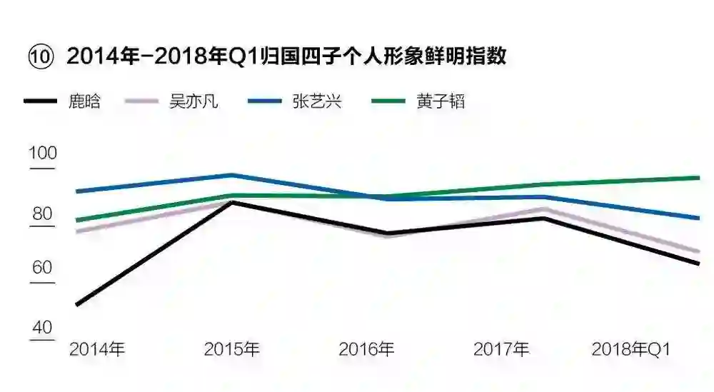 商业周刊(中文版)曾详细分析过“归国四子”的现状:黄子韬个人形象鲜明指数在归国四子中最高,且呈上升趋势,其他三子的形象鲜明指数则呈下降趋势,鹿晗的形象鲜明指数在归国四子中最低。