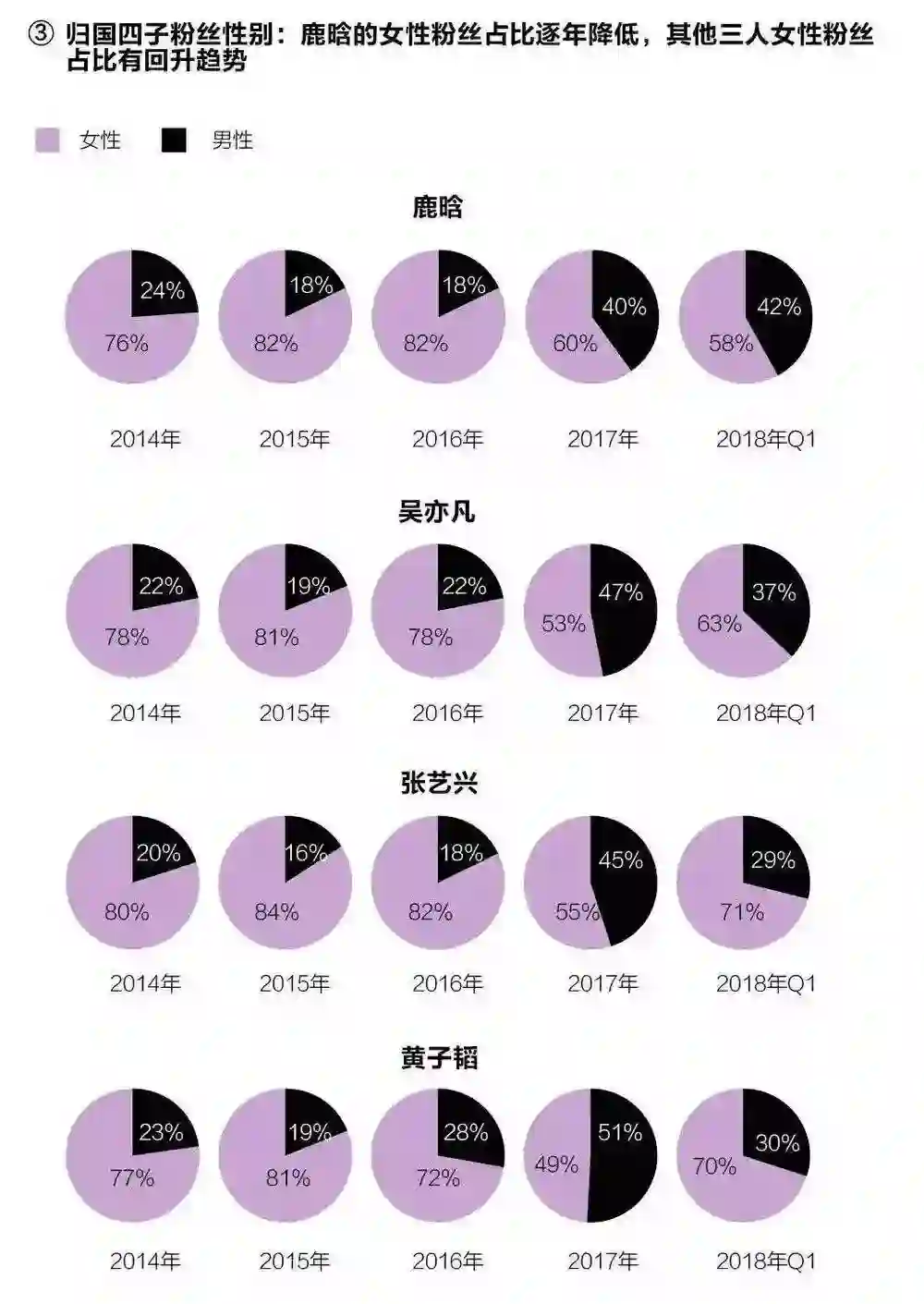 根据艾漫市场中心的统计数据,“归国四子”中,2018年第一季度鹿晗的核心粉丝占比下降,其他三子均有所提升(根据粉丝对艺人情感表达的程度,调查将归国四子的粉丝分为核心、普通和路人粉丝三级))。对于鹿晗这类的偶像明星来说,核心粉丝最最容易转化成市场购买力。