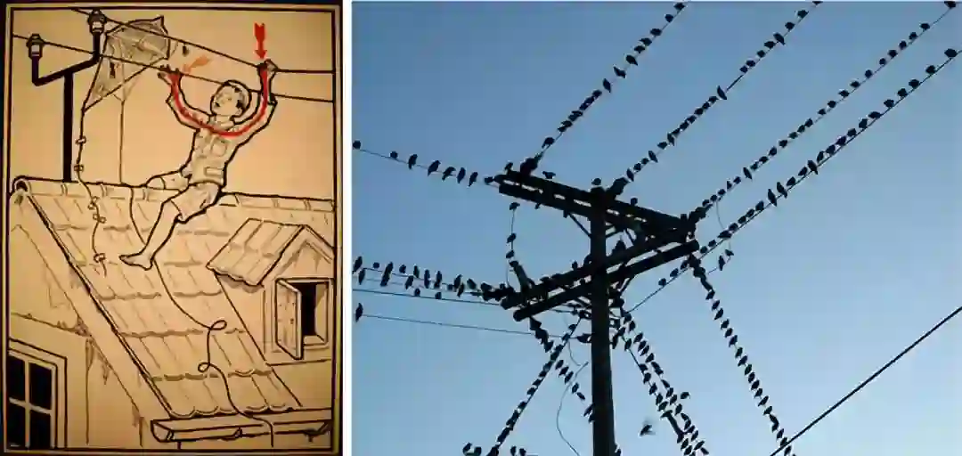 右图:落在单根电线上的小型鸟类很难发生触电事故(图片来源:Photo credit- frankieleon on Visual hunt / CC BY))
