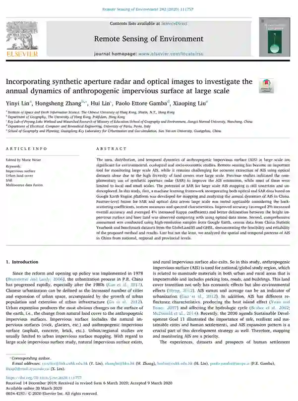 引用格式:Lin, Y., Zhang, H., Lin, H., Gamba, P. E., & Liu, X. (2020). Incorporating synthetic aperture radar and optical images to investigate the annual dynamics of anthropogenic impervious surface at large scale. Remote Sensing of Environment, 242, 111757.