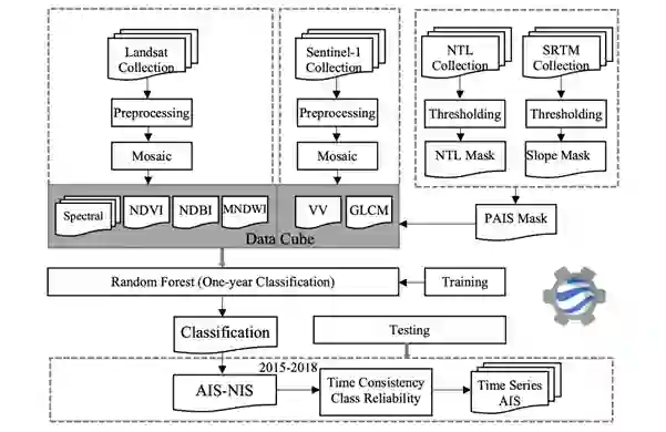 在这个PAIS中,计算出Landsat的光谱特征和相关的植被指数及Sentinel-1的后向散射和纹理特征,在特征选择后,利用随机森林算法将SAR数据和光学数据进行特征级融合。