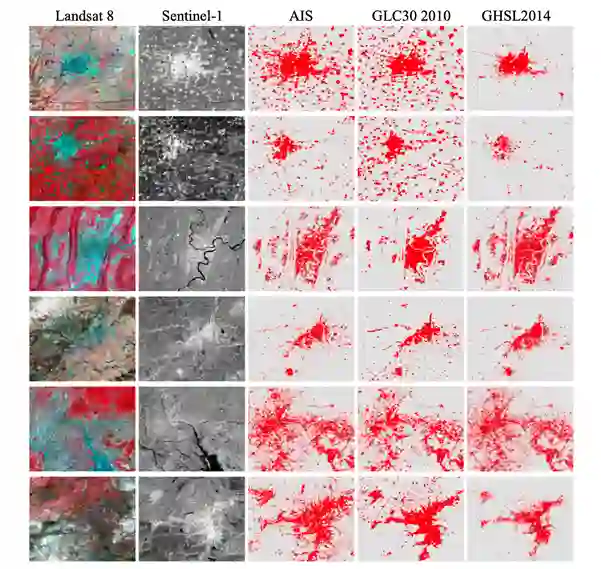 本研究通过定性和定量分析对融合光学和SAR进行不透水面提取的结果(AIS)进行评估。通过AIS和GHSL、GlobeLand30的不透水面数据进行比较,重点分析了城市、郊区、山区、三角洲、沙漠的不透水面提取情况。可以看到,AIS不仅能区分郊区的不透水面,同时在城区可以保持不透水面良好的形态。同时,在山区、三角洲、沙漠地区的结果也相对可靠。由于SAR对人工地物的较强的后向散射特性,在图像中VV极化通道呈现出高的强度,可以帮助区分不透水面和裸土。通过精度的比较,相对于仅使用光学数据,SAR数据可以提高2%的总体精度。