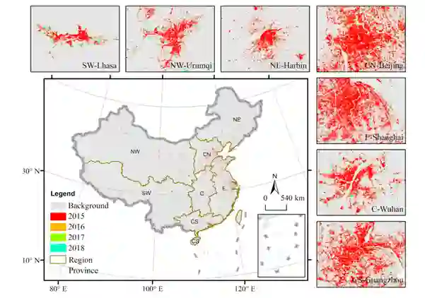 2015年到2018年的不透水面提取结果为图1,文章选取了7个典型区域进行不透水面变化的展示,可以看到不透水面在华北、东部、华南地区相对密度高且紧凑,而西北、北部、和中部地区的分布则相对比较稀疏。